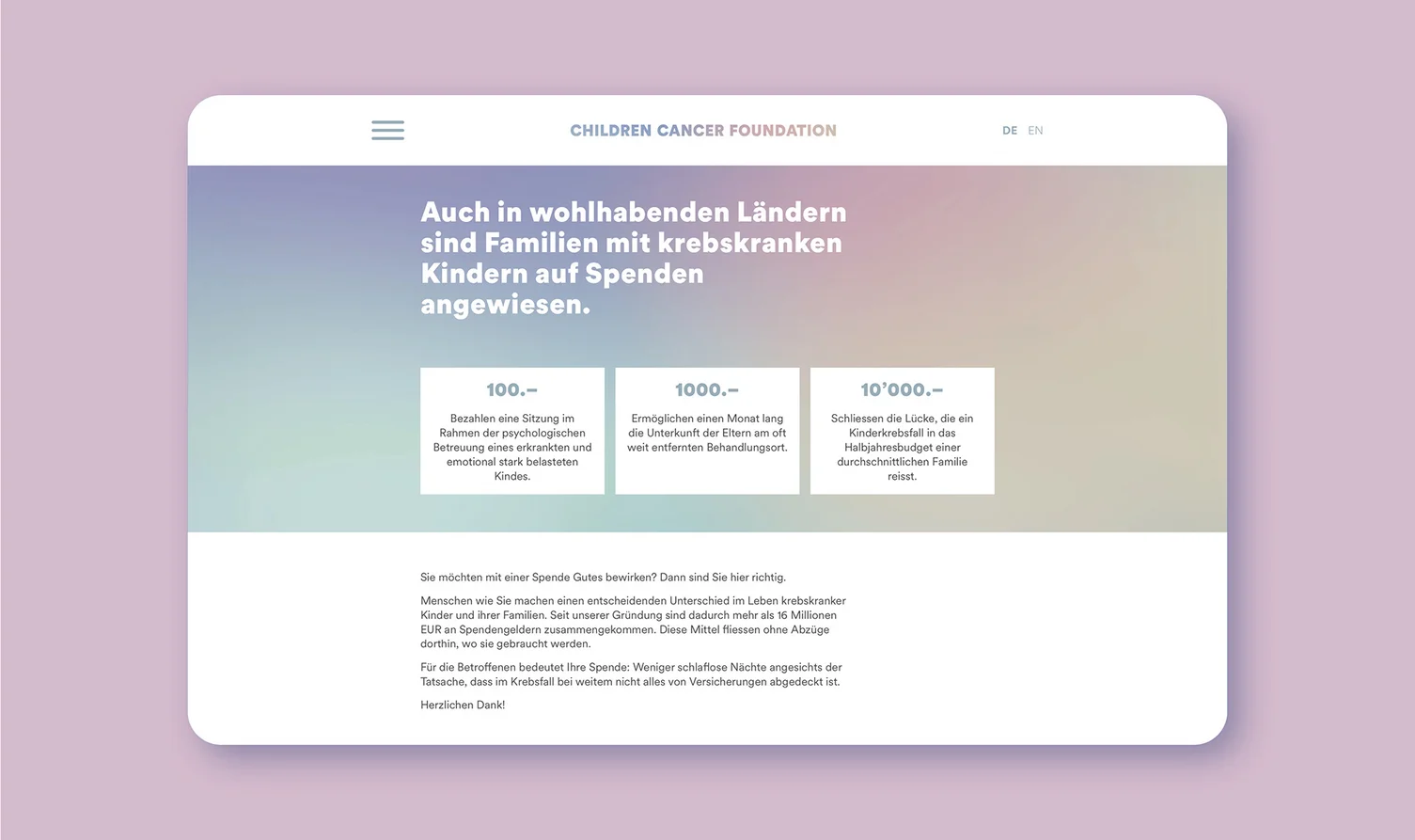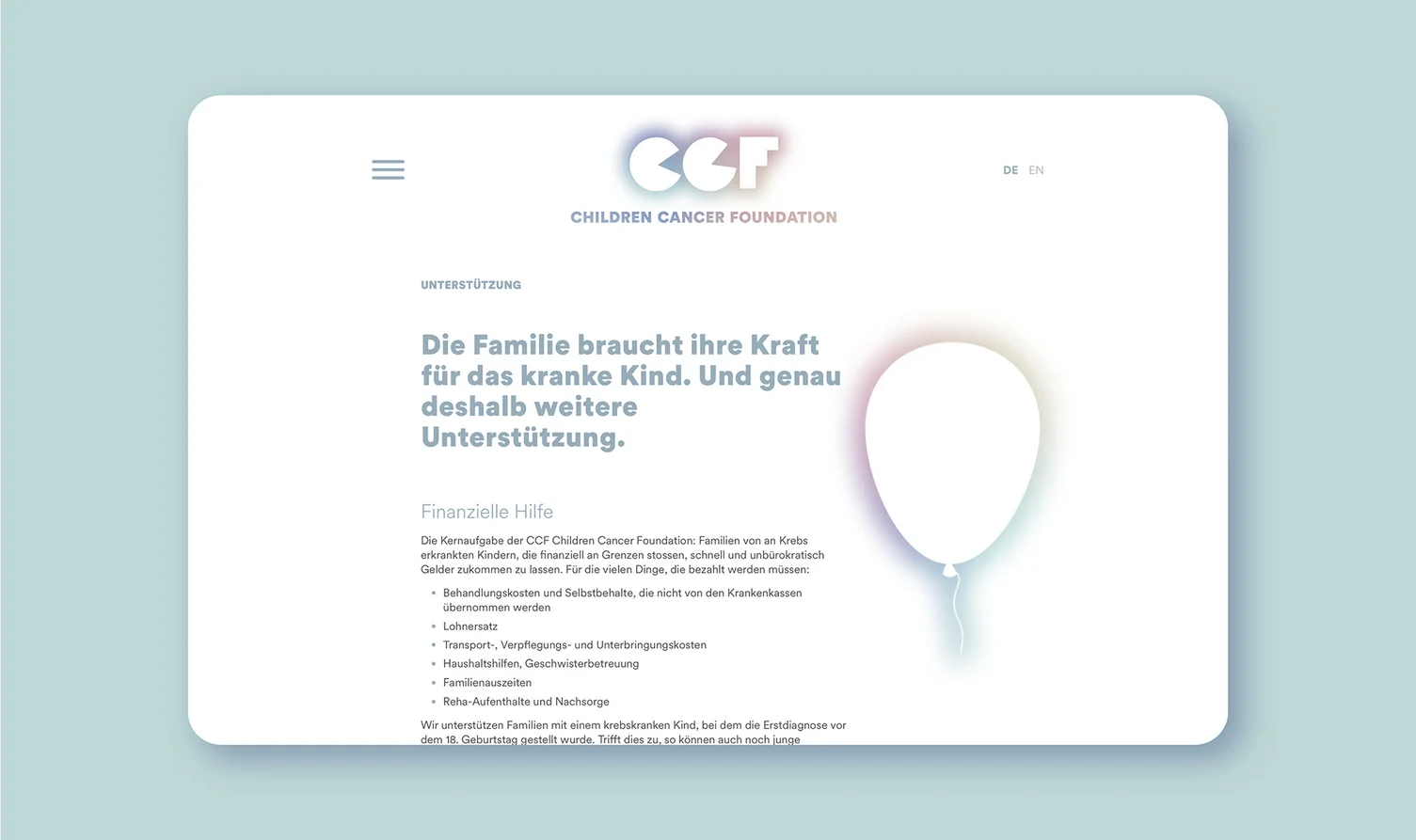 Selbst Stiftungen, die seit Jahren erfolgreich im Hintergrund wirken, müssen sich heute adäquat darstellen. Leicht, aber entschlossen: Der von uns entwickelte Gesamtauftritt verspricht Entlastung und Zuversicht für Familien in Not.