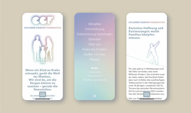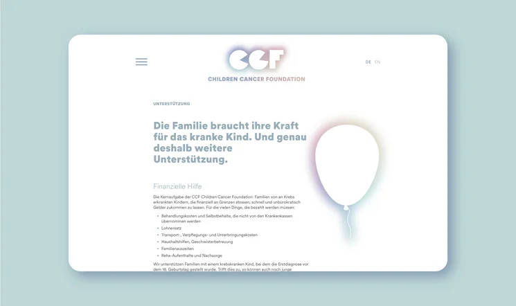 Bei der Entwicklung des Gesamtauftritts der Marke wurde uns schnell klar, dass jedes Design ausscheidet, das an medizinische oder therapeutische Dienste erinnert, welche die Stiftung nicht anbietet. Ebenfalls nicht in Frage kamen die typischen visuellen Codes für Kinderthemen. Weil die CCF kein Spitalclown ist, sondern die erfahrene und gut vernetzte Logistikerin, die Familien effektiv entlastet und so auch emotional erleichtert.